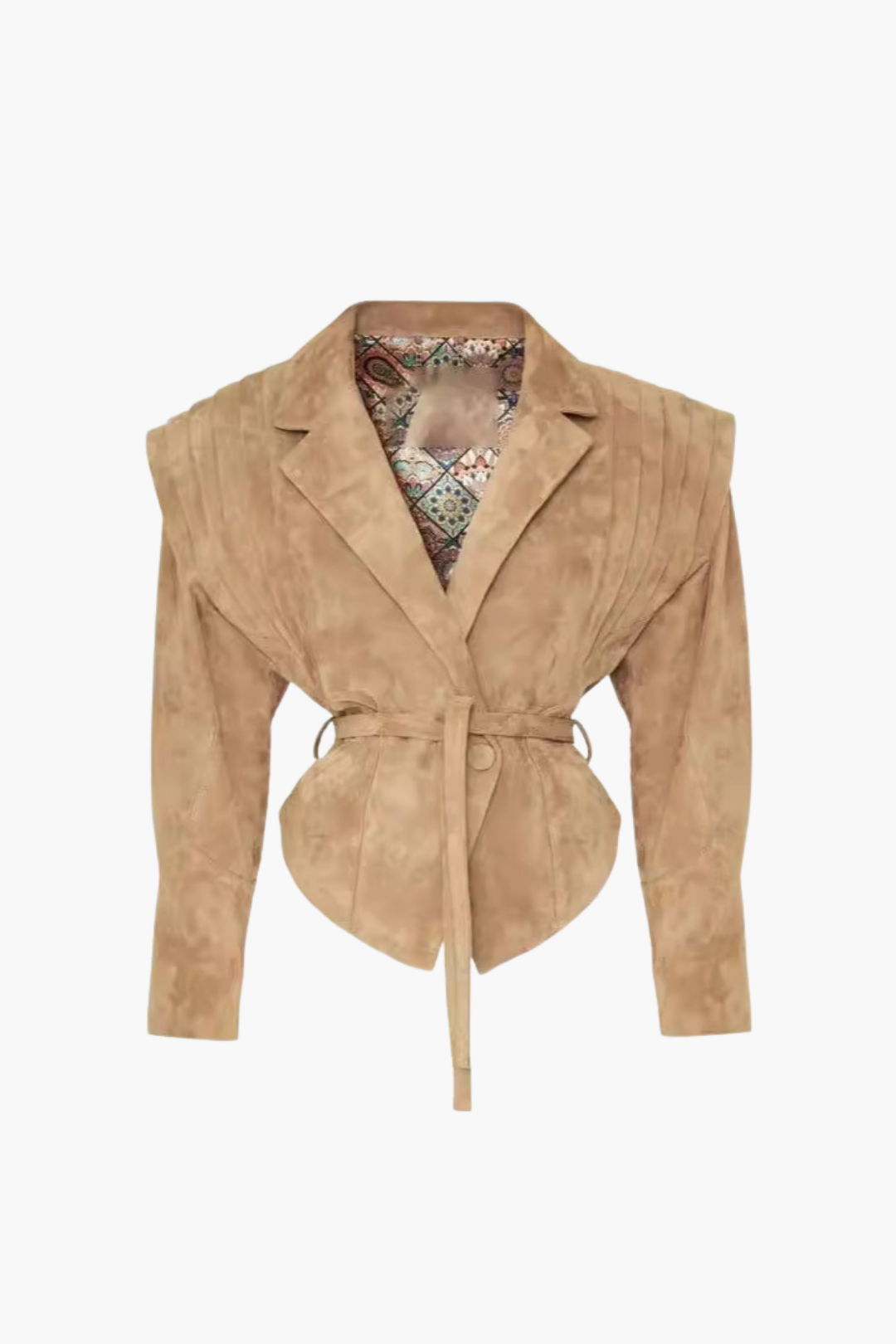 Cette veste incarne l'alliance de l'élégance sophistiquée et de la modernité dans la garde-robe de la femme Vandoria. Ses détails sculpturaux aux épaules et son lien à la taille soulignent son assurance. Que vous souhaitiez créer un look affirmé en ville ou sublimer votre style pour une occasion spéciale, c'est un incontournable de votre garde-robe.