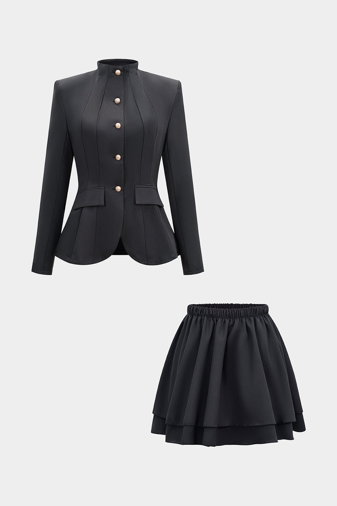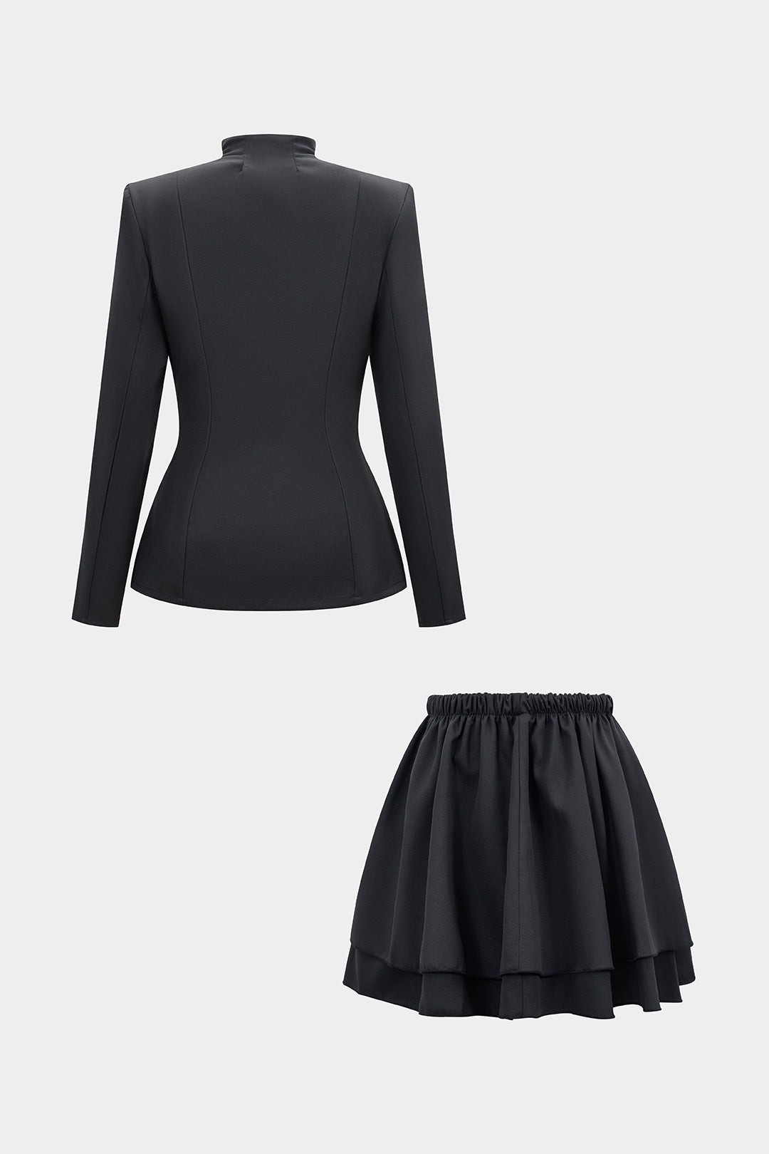 Avec sa veste cintrée et sa jupe légèrement superposée, elle crée une silhouette à la fois affirmée et gracieuse, parfaite pour les journées en ville, les occasions raffinées et les moments où le style prime sur les mots.