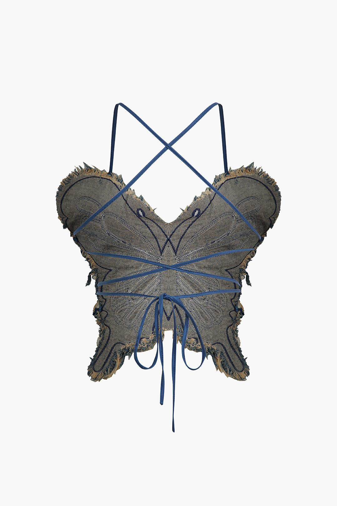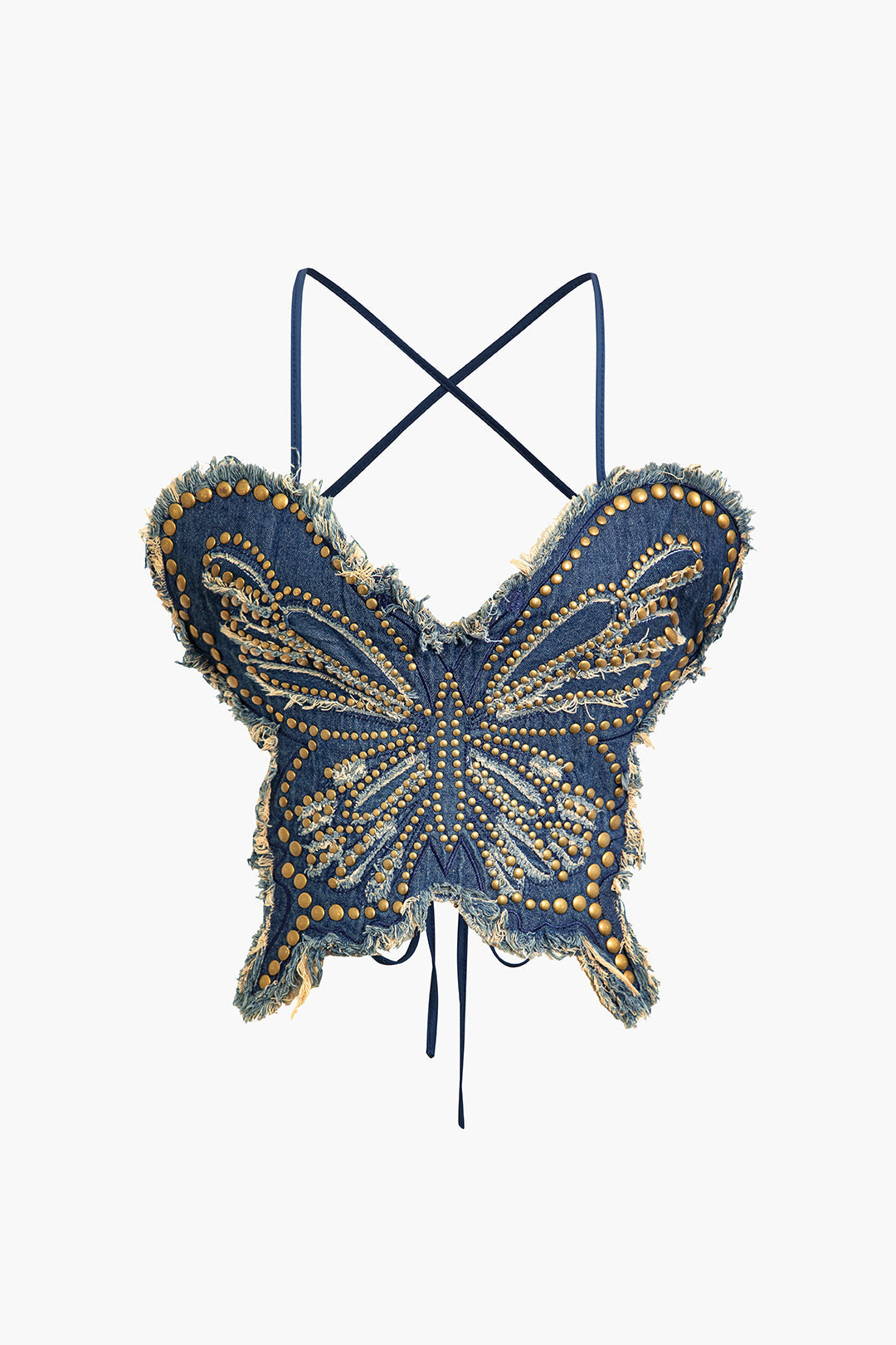 Conçu pour les femmes sûres d'elles qui souhaitent faire la différence, Stellar Wings s'impose avec sa forme papillon et ses pierres cloutées. Son denim et ses ourlets à pompons créent une ambiance rebelle, tandis que l'élégant lien au dos apporte un équilibre féminin. Cette pièce transforme la mode urbaine en œuvre d'art.