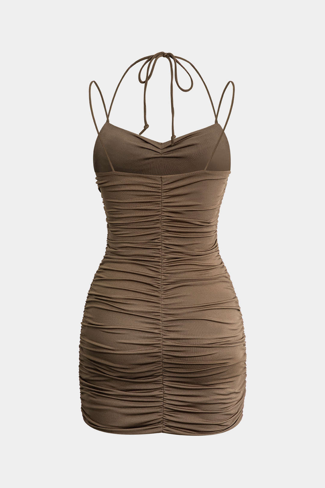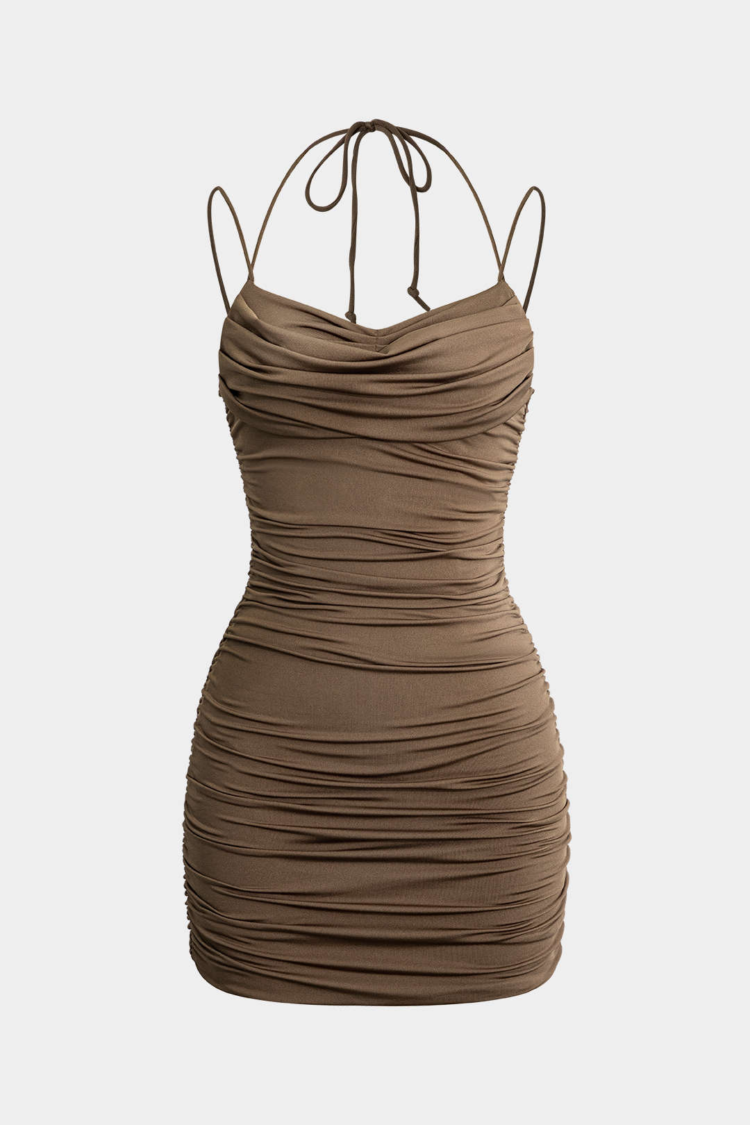 Cette robe présente une élégante coupe nuisette avec des détails froncés qui subliment votre silhouette. Des liens à nouveau dans le dos offrent un ajustement personnalisé. De fines bretelles drapent les épaules, apportant une touche féminine. Sa longueur mini lui confère un look chic et confortable.