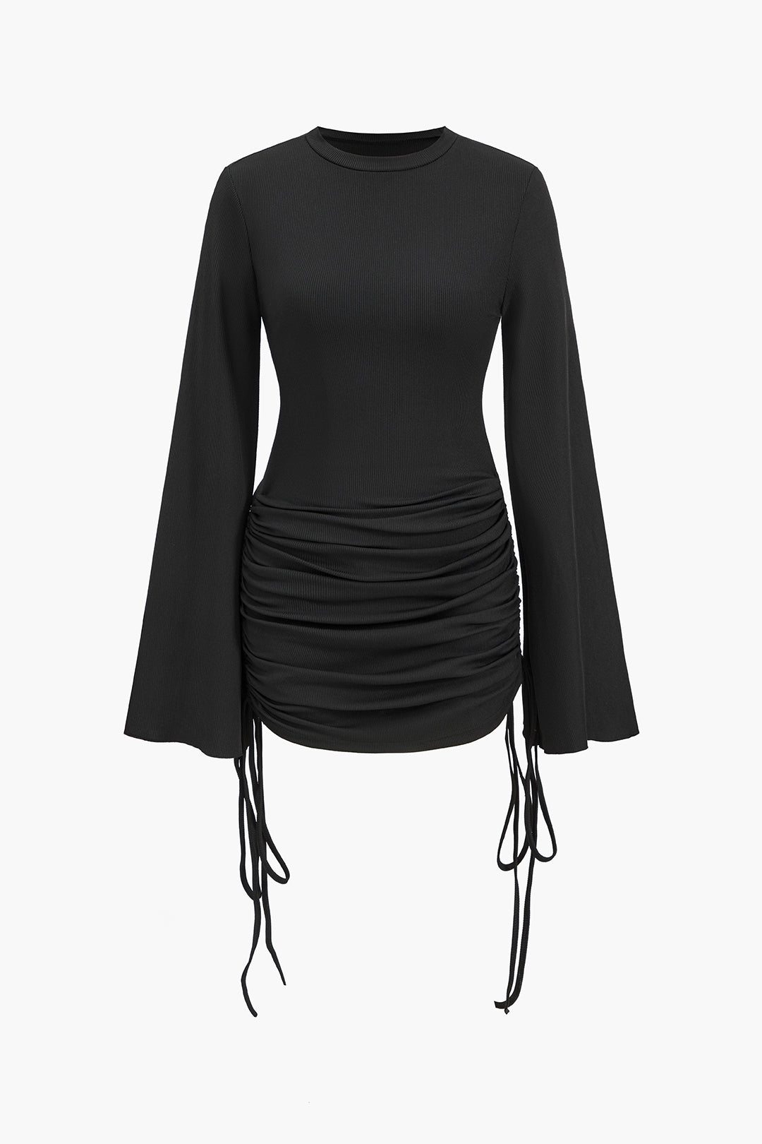 Robe courte à manches longues et col rond froncé avec cordon de serrage