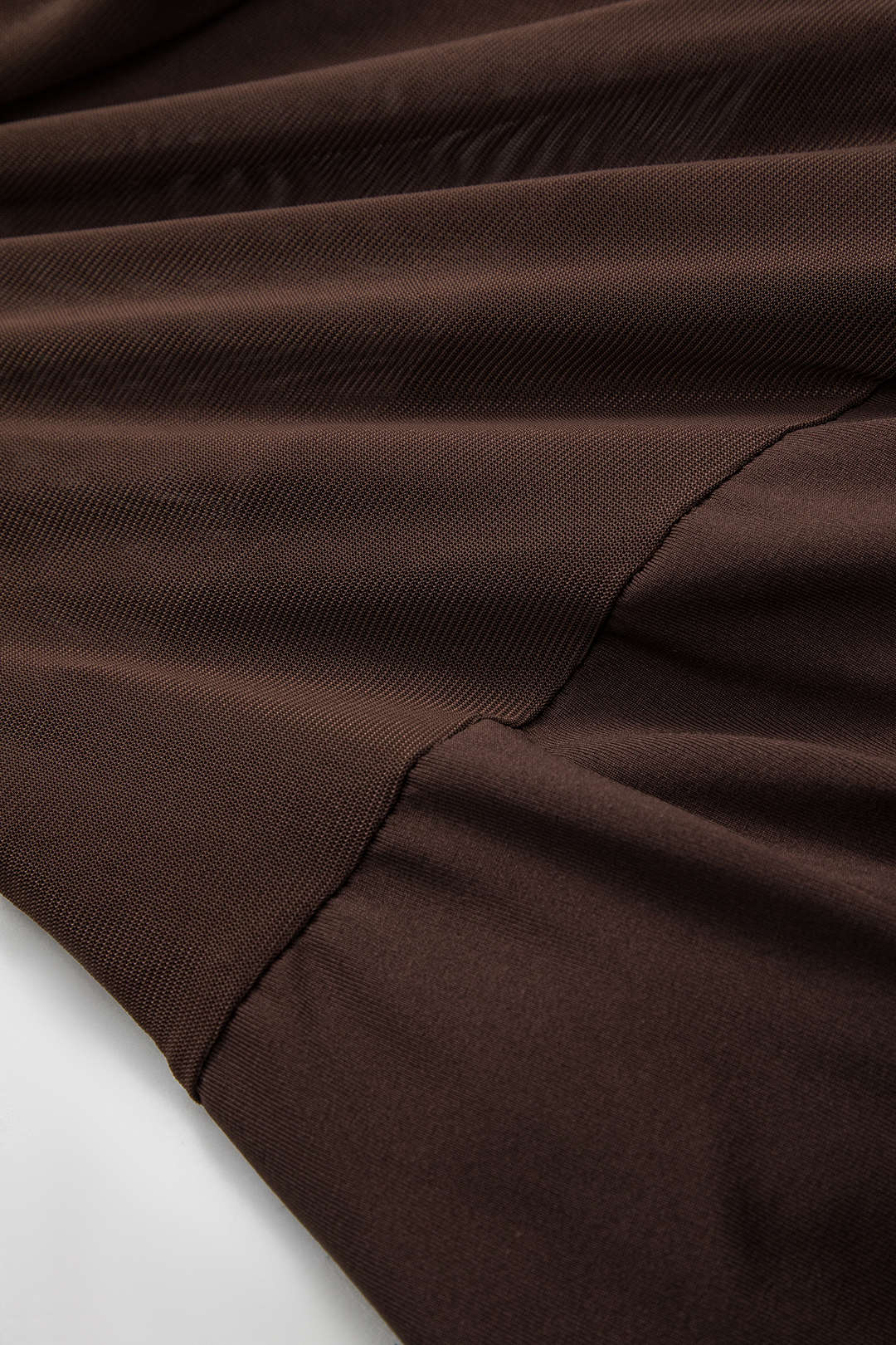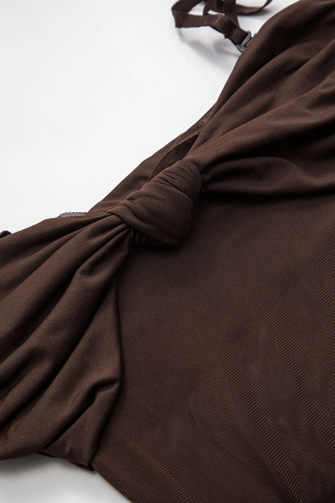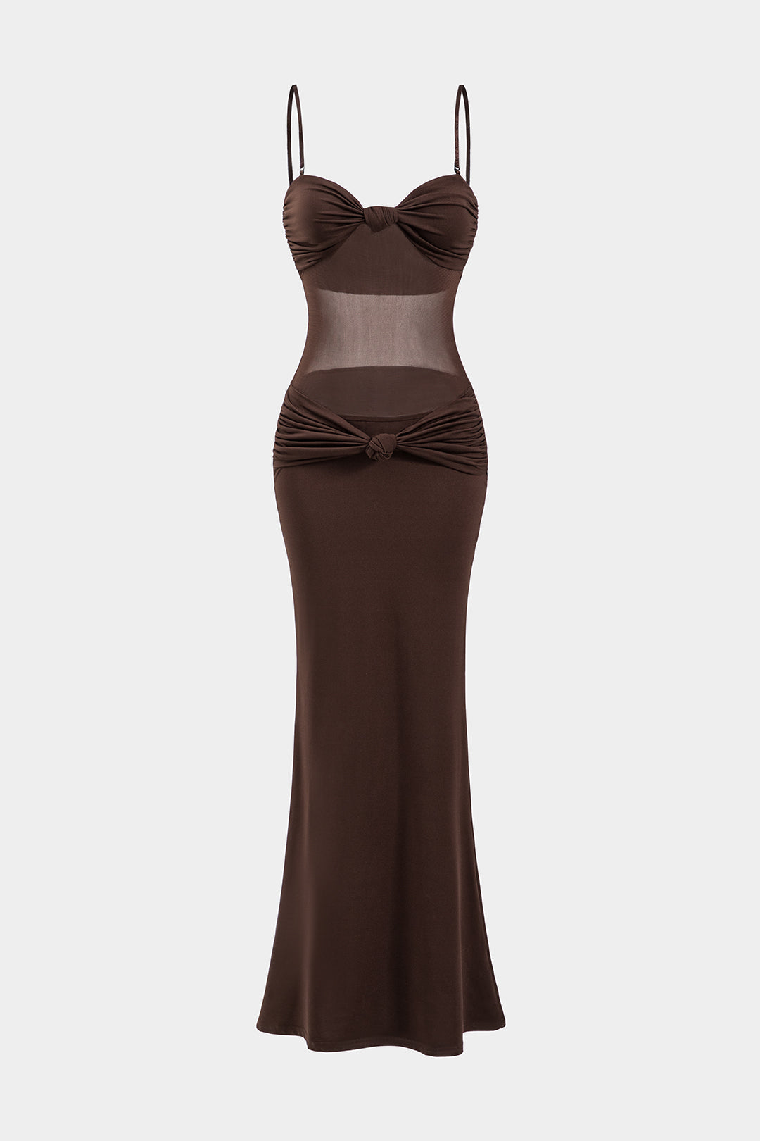 La robe présente une coupe qui épouse élégamment la silhouette, légèrement évasée en bas pour une silhouette élancée. Le nœud torsadé sur le devant apporte une touche d'élégance et de modernité. Les fronces accentuent le mouvement à partir de la taille, conférant à la robe une allure dynamique. De fines bretelles et une longueur maxi lui confèrent une touche sophistiquée.